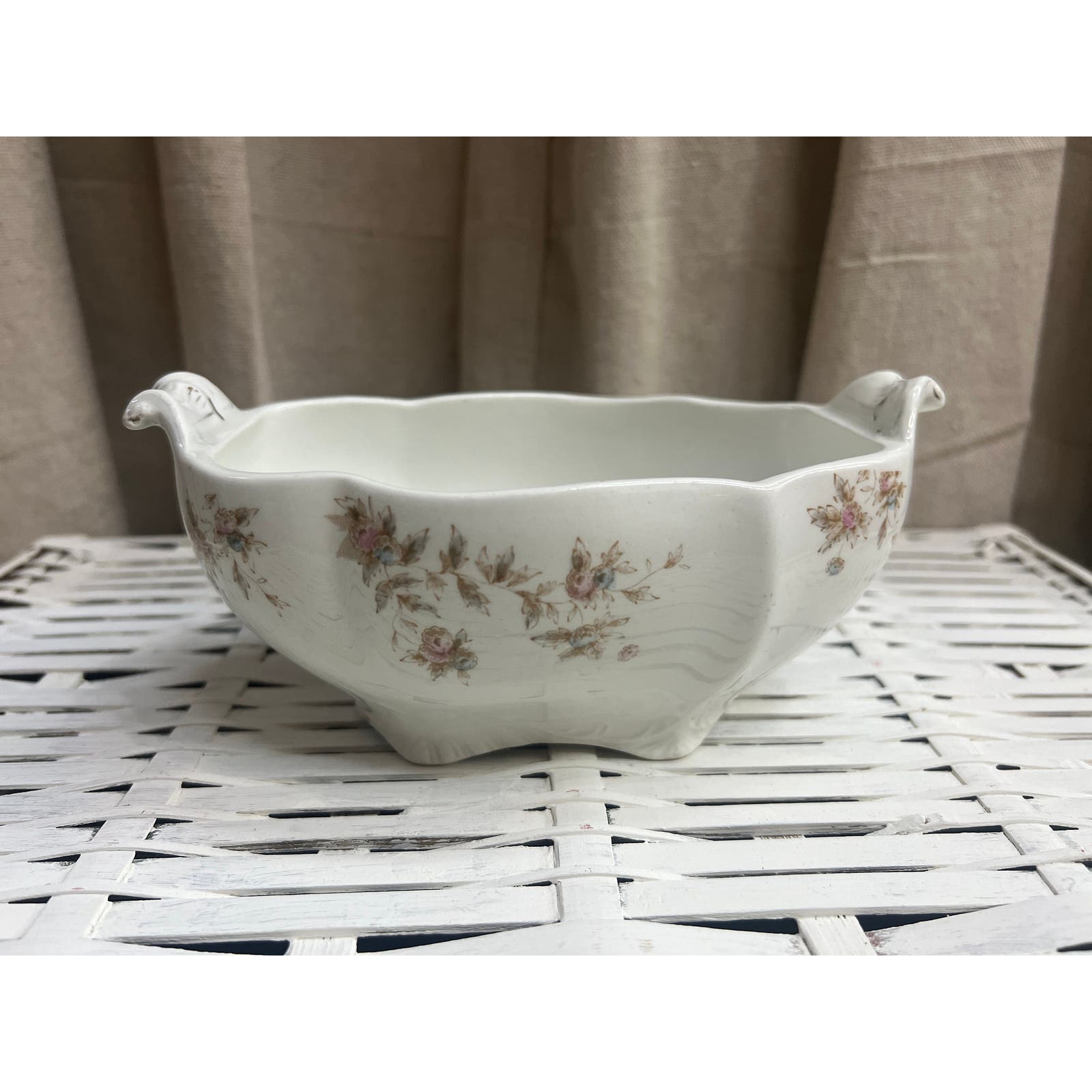 Beautiful small ironstone serving dish by Johnson Bros England. This has a gorgeous delicate floral pattern. Marked with Johnson Bros mark and two other marks. One stamp is Pat. Date June 27, 93, the other Rd No 208597. Late 1800’s mark. Measures 3.25” tall with handles, 7” long with handles, 4.25” wide. No chips or cracks and pattern is in great condition.
