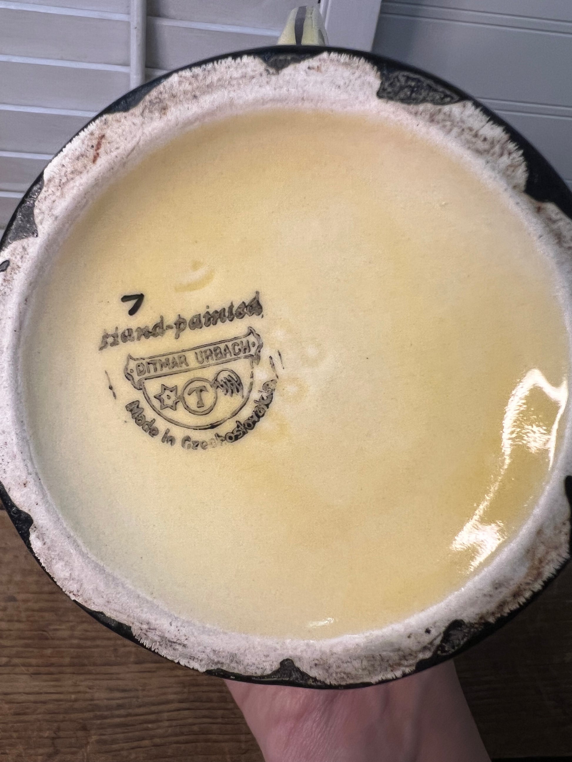 This is an absolutely beautiful picture that any collector will appreciate its beauty and rarity. This pitcher was produced in the 1930s.It is hand painted in beautiful Yellow Red and Black. 880 is stamped in the glaze at the bottom. It is in very good condition with no cracks or paint loss and no crazing, but has one very tiny chip at the top inner rim of the spout. See photos. It stands roughly 9 3/8 inches high.