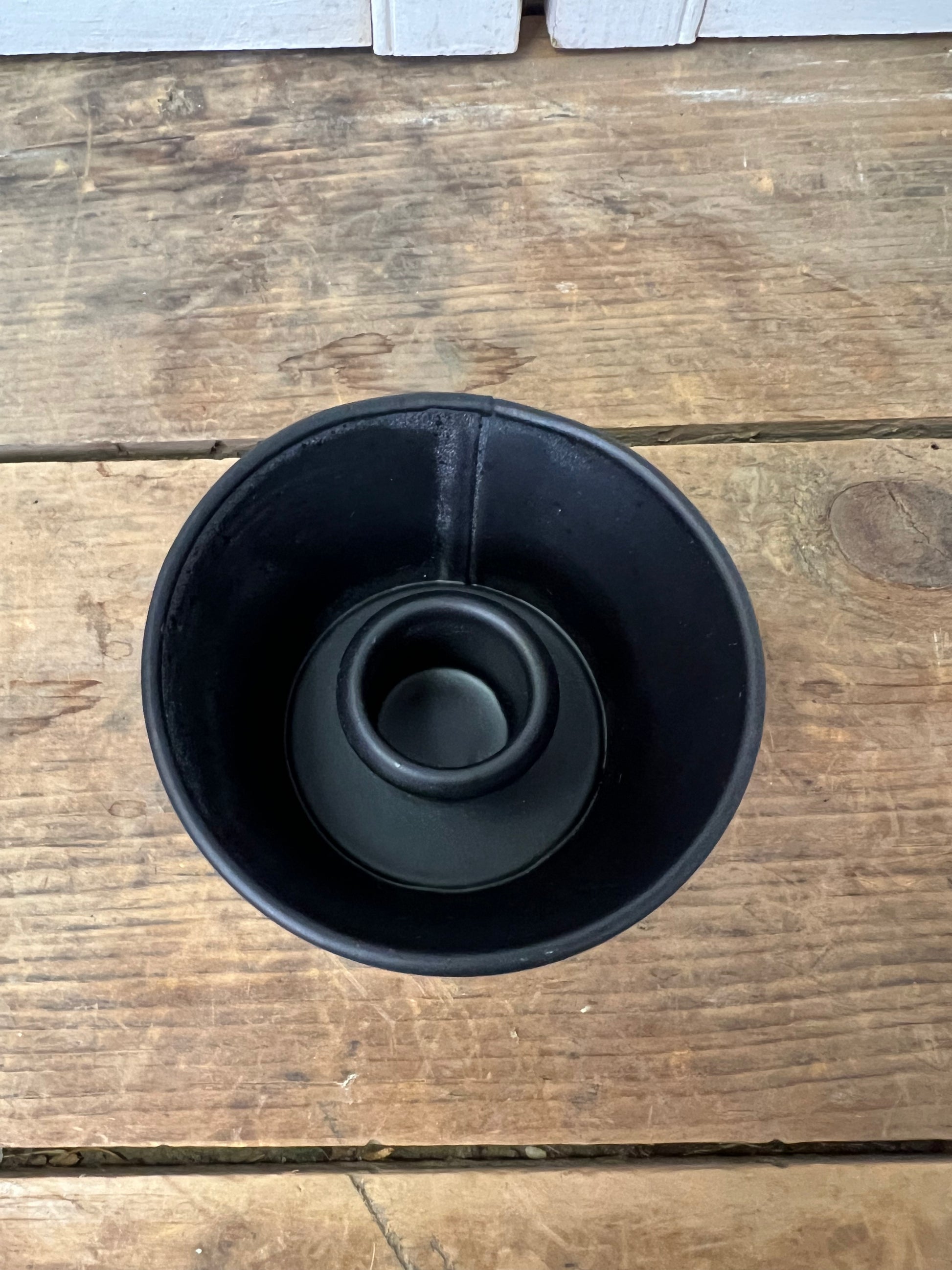 Old black metal primitive style taper cup candleholder. 3” diameter top 2” base
