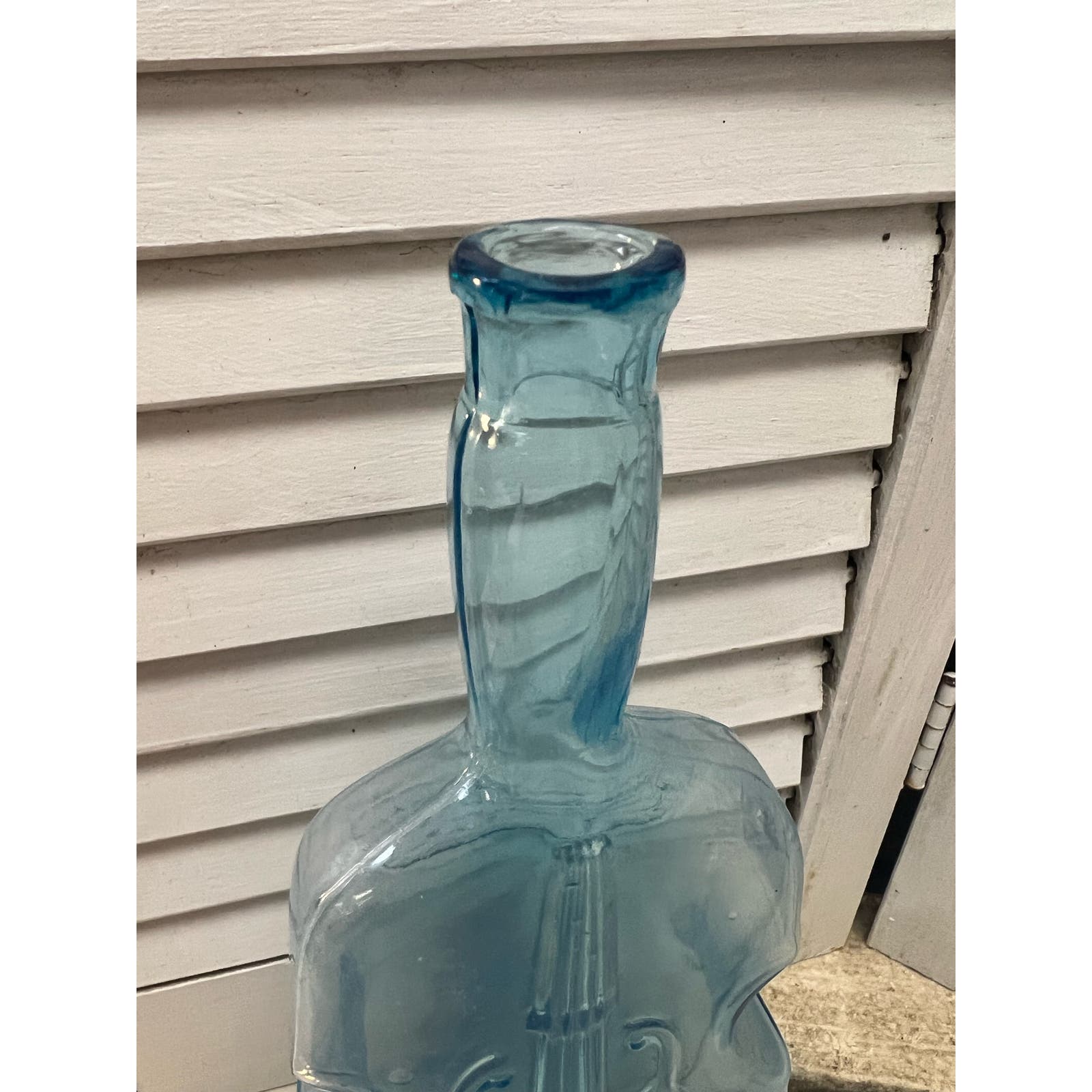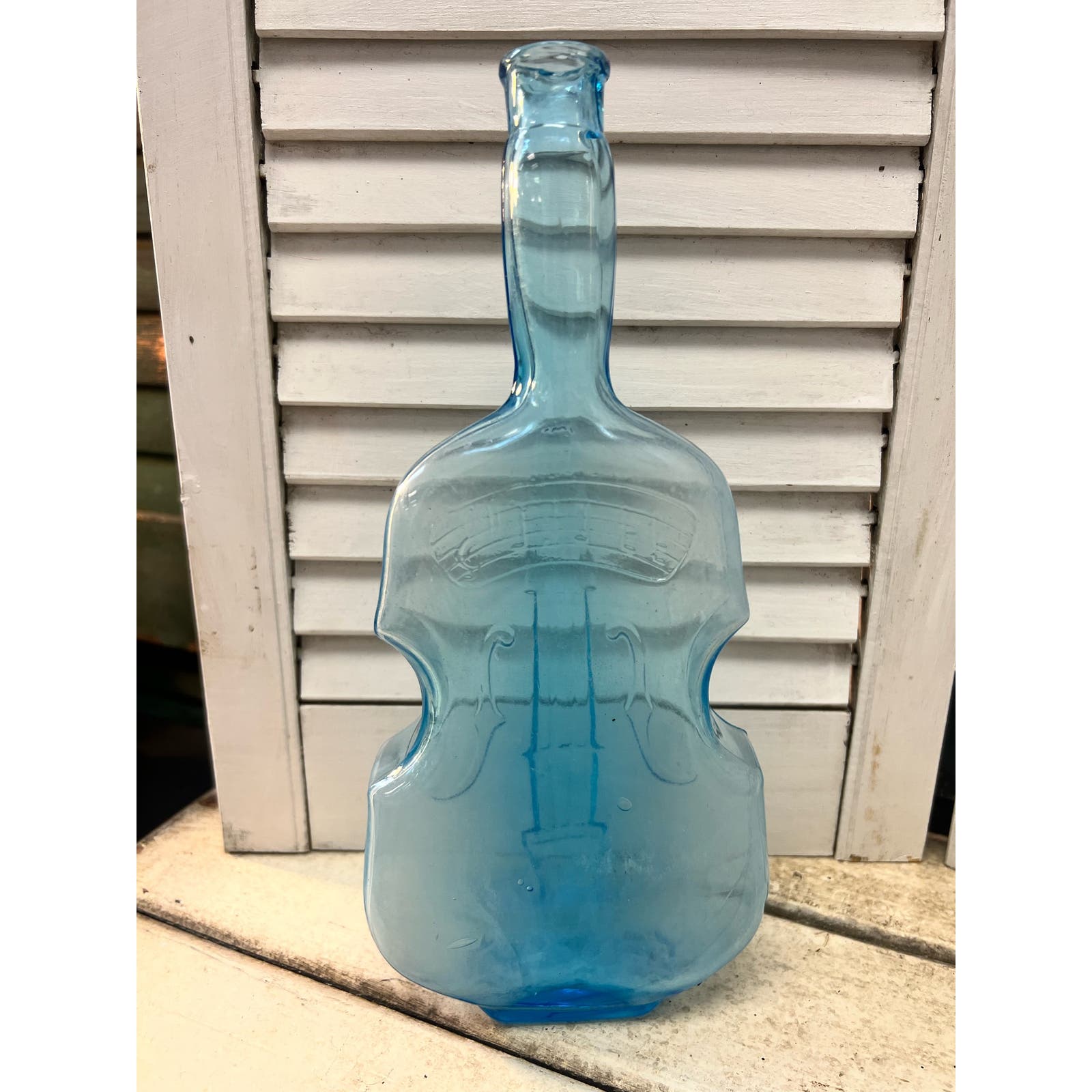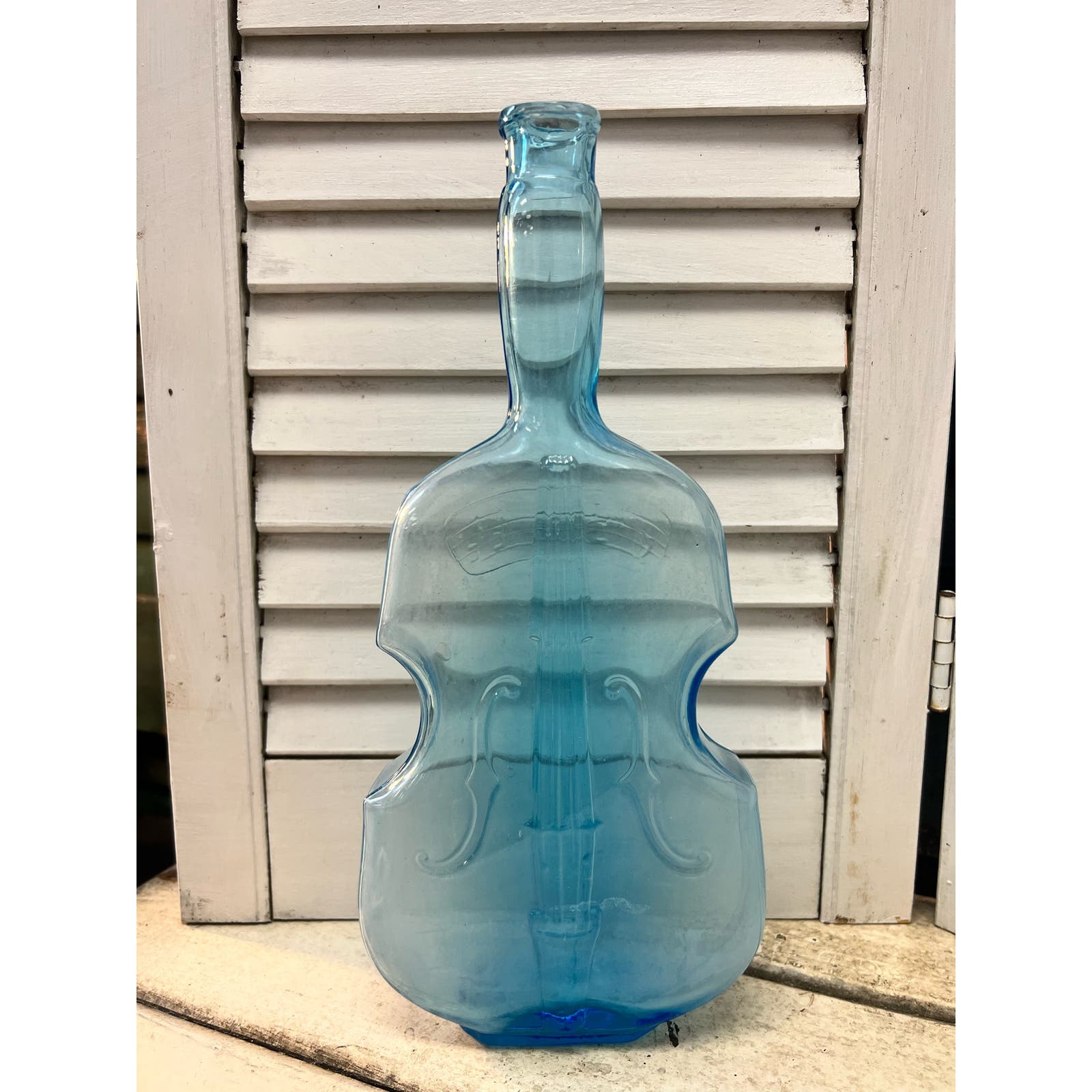 Vintage blue glass violin bottle. The bottom is a little wobbly. No chips or cracks but is a little cloudy inside. Measures 9.75” tall, 4.5” wide, 1.5” deep