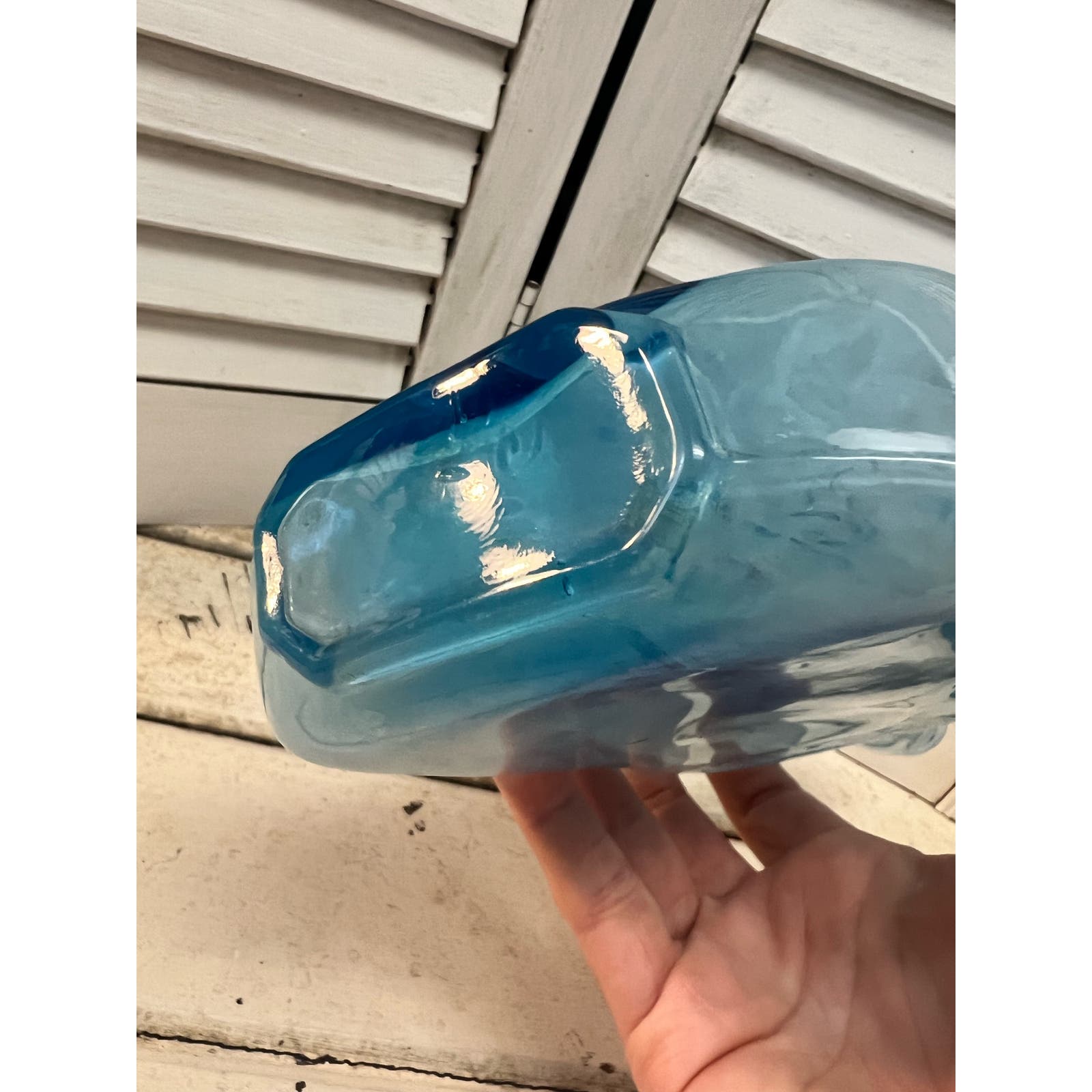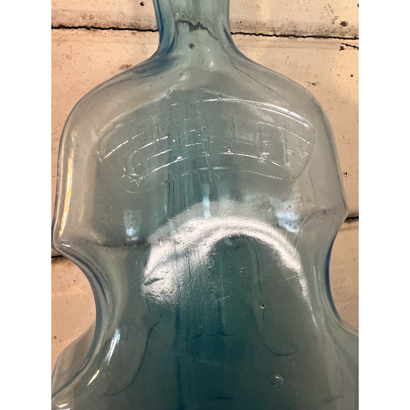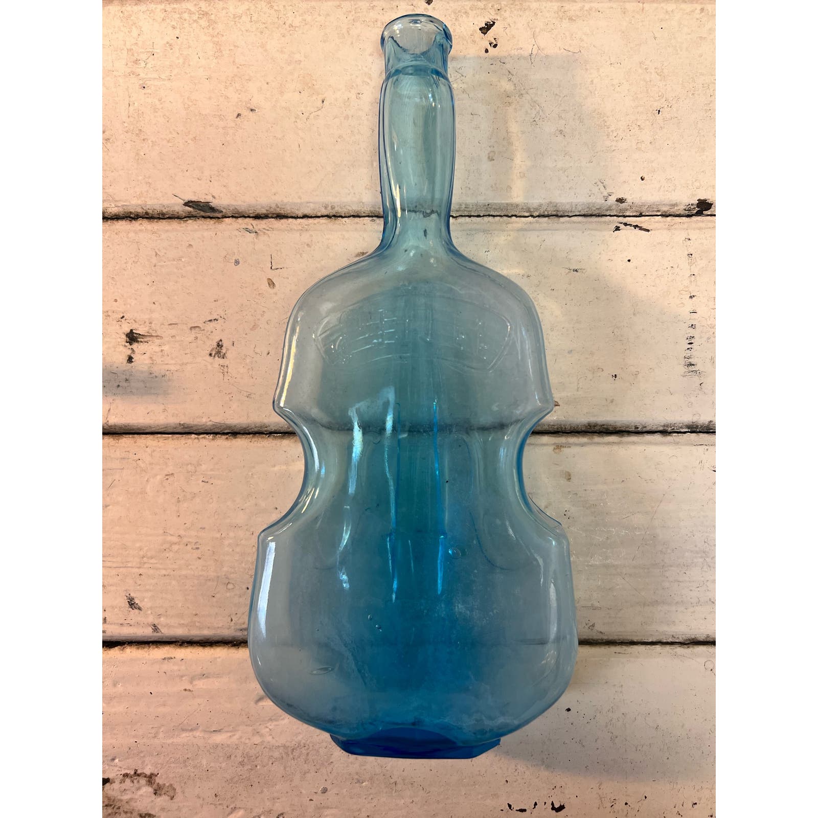 Vintage blue glass violin bottle. The bottom is a little wobbly. No chips or cracks but is a little cloudy inside. Measures 9.75” tall, 4.5” wide, 1.5” deep